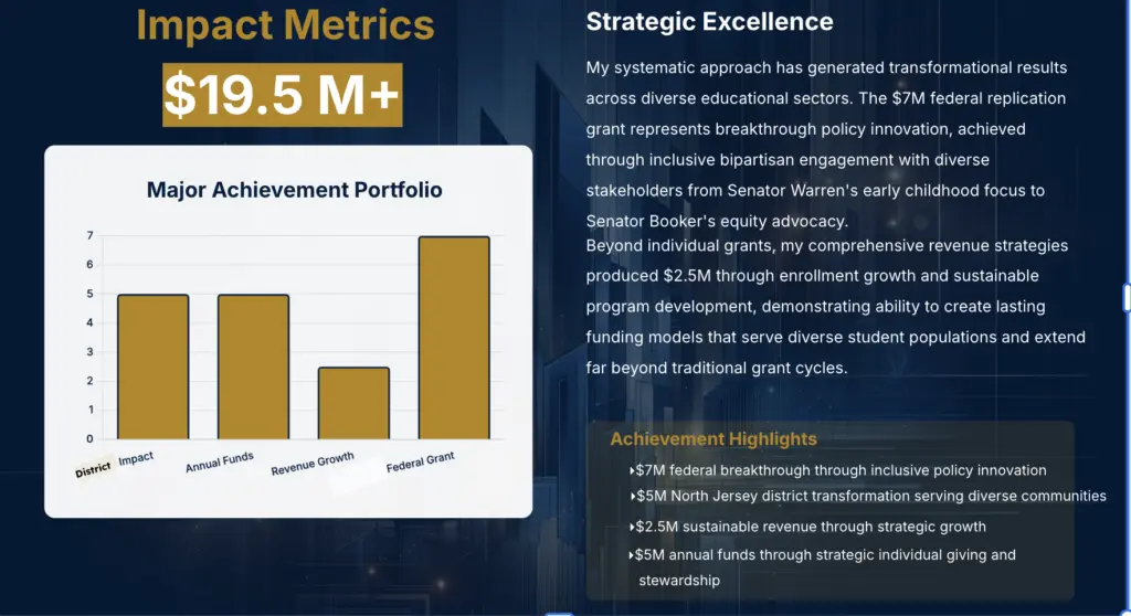 These integrated efforts drove a 33% increase in student enrollment, directly generating $2.5 million in new revenue. Social media engagement doubled, solidifying my organization’s profile and activating a passionate stakeholder base. The donor pipeline diversified and stabilized, setting the stage for future growth and reducing dependence on any single funding model.